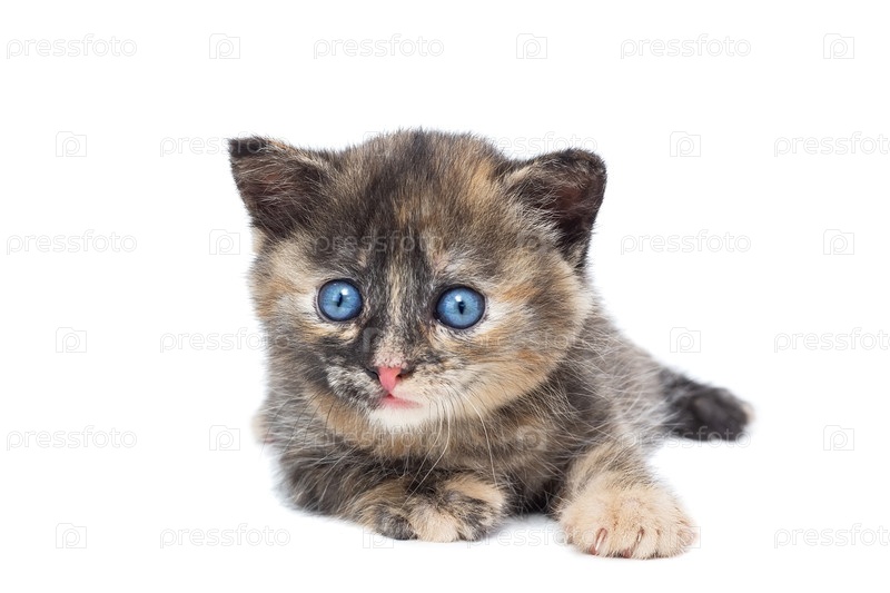 Серый трехцветный котенок на белом фоне