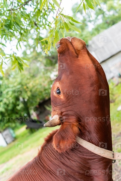 Теленок ест листья с дерева подняв голову вверх