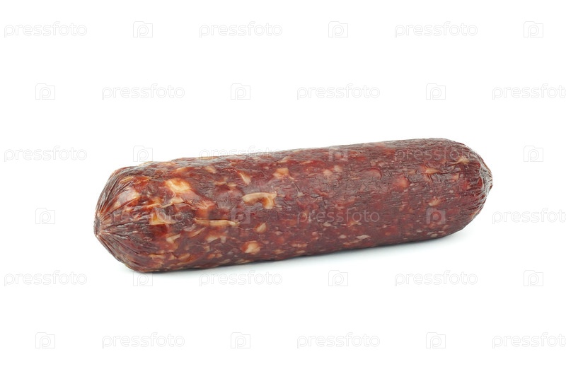 Кусок копченой колбасы салями, изолированный на белом фоне