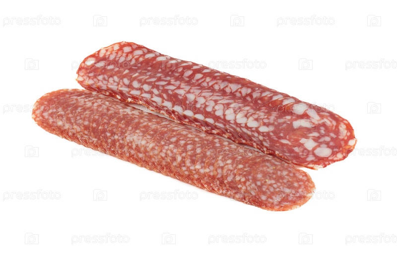 Копченые ломтики колбасы. Изолированные на белом фоне. Крупный план
