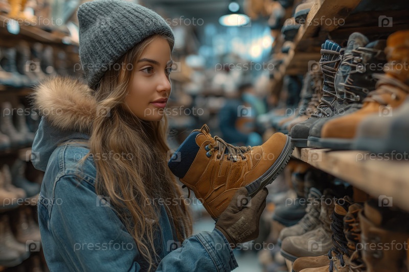 Молодая женщина выбирает треккинговые ботинки в магазине