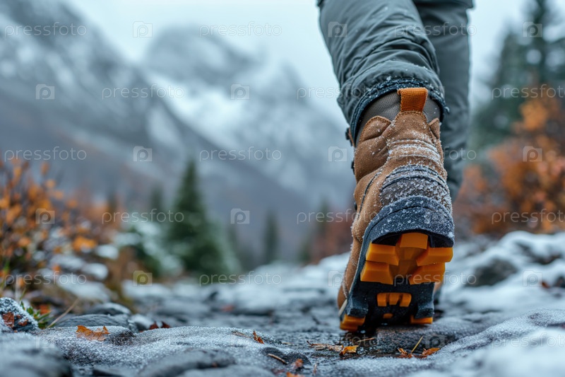 Трекинговые ботинки на ногах туриста, идущего по зимним горам, крупный план