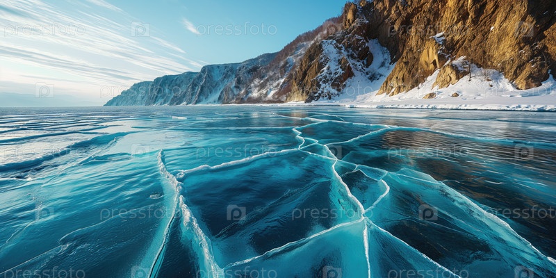 Зимний вид на большое замерзшее озеро с гористым побережьем
