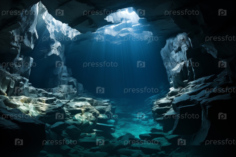 Подводная пещера с солнечным светом, пробивающимся сквозь воду