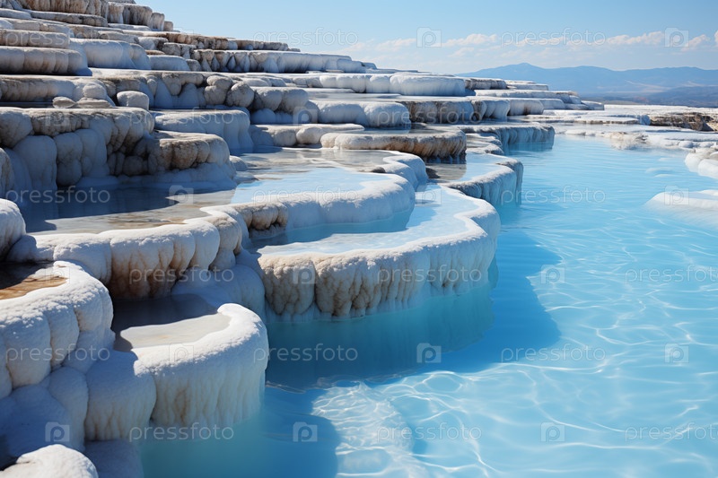 Ландшафт с травертиновыми бассейнами и террасами с голубой водой