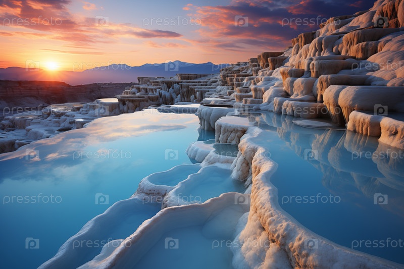 Пейзаж с травертиновыми бассейнами и террасами с голубой водой на закате