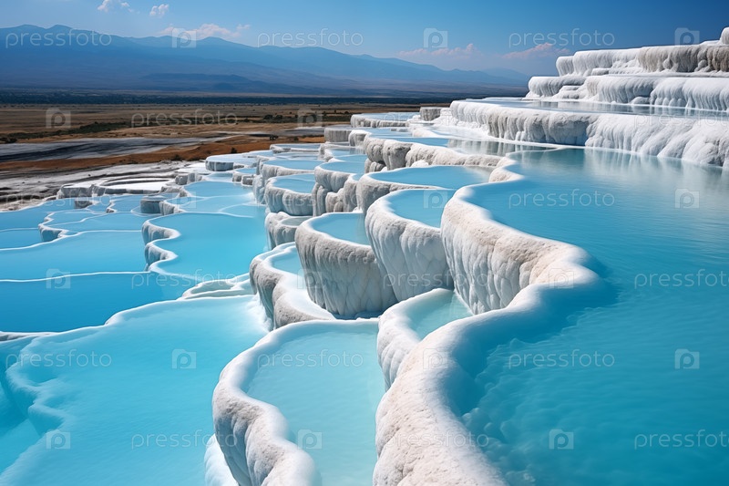 Ландшафт с травертиновыми бассейнами и террасами с голубой водой