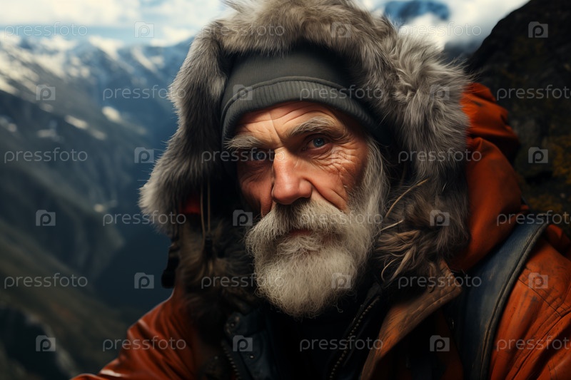 Портрет пожилого мужчины в теплой зимней одежде на фоне гор
