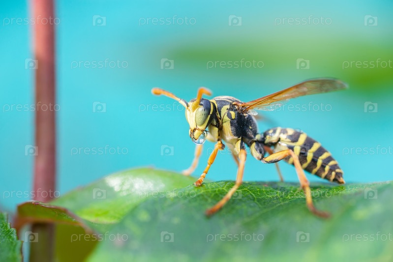 Оса сидит на зеленых листьях. Опасная желто-черная полосатая оса сидит на листьях