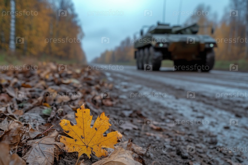 Военная техника на грунтовой дороге за осенней листвой на переднем плане