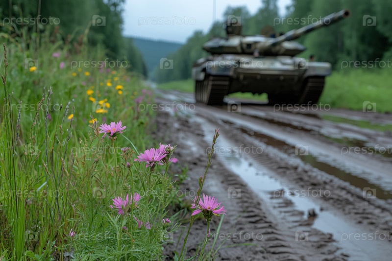 Танк на дороге в лесу с цветком на переднем плане