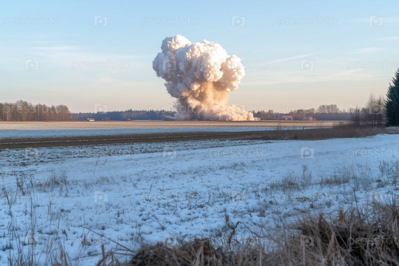 Огромное облако дыма после взрыва над полем зимой