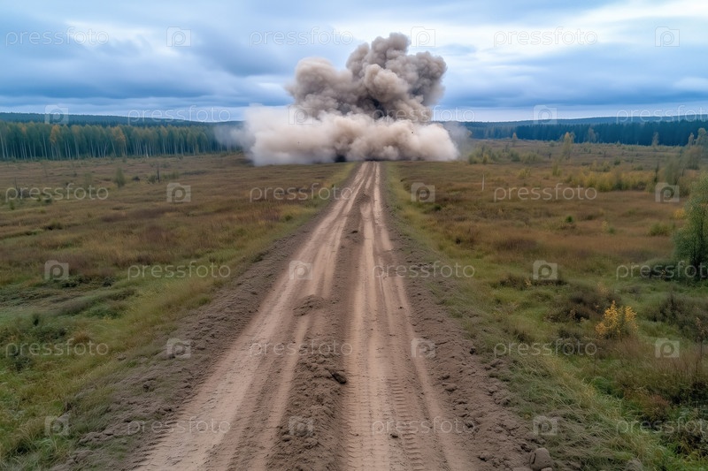 Грунтовая дорога посреди степи с большим облаком дыма после взрыва