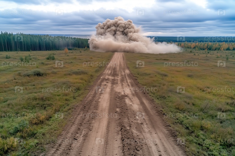 Вид с воздуха на лесную дорогу с мощным взрывом