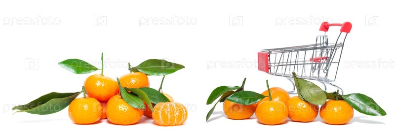 Свежие мандарины и тележка для покупок на белом изолированном фоне