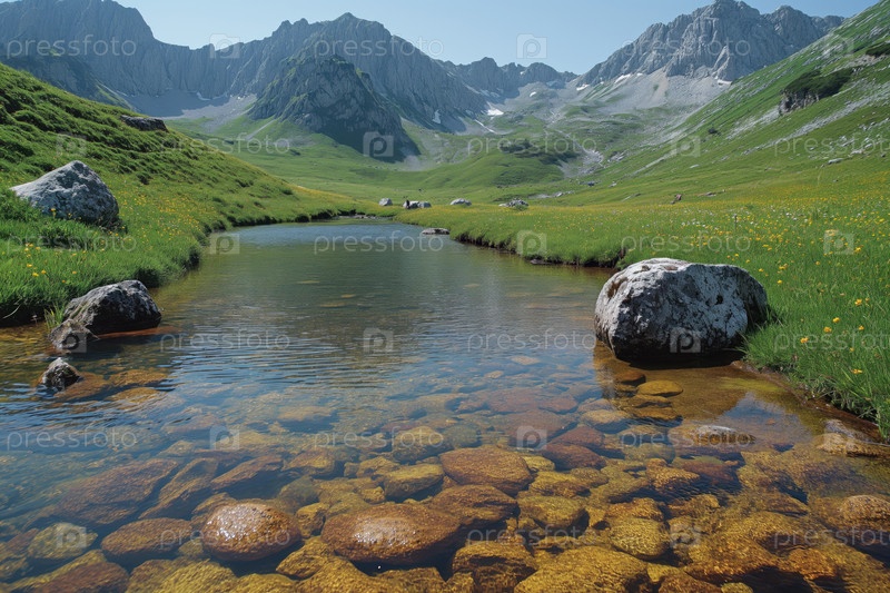 Чистое озеро с прозрачной водой среди альпийских лугов в высокогорной долине