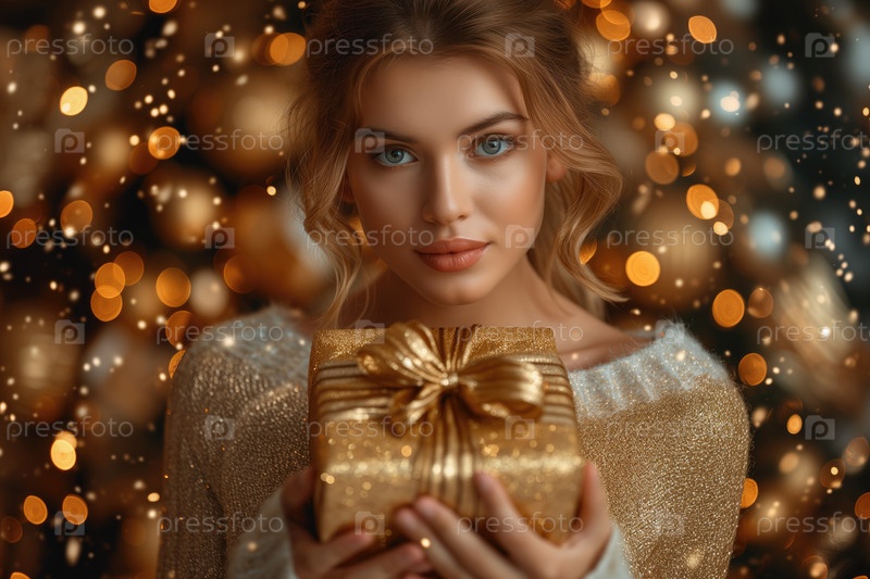 Красивая девушка протягивает коробку с подарком на фоне с блестками
