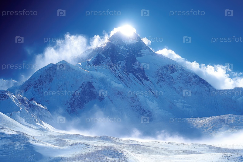 Альпийский пейзаж, солнце светит с вершины заснеженной горы