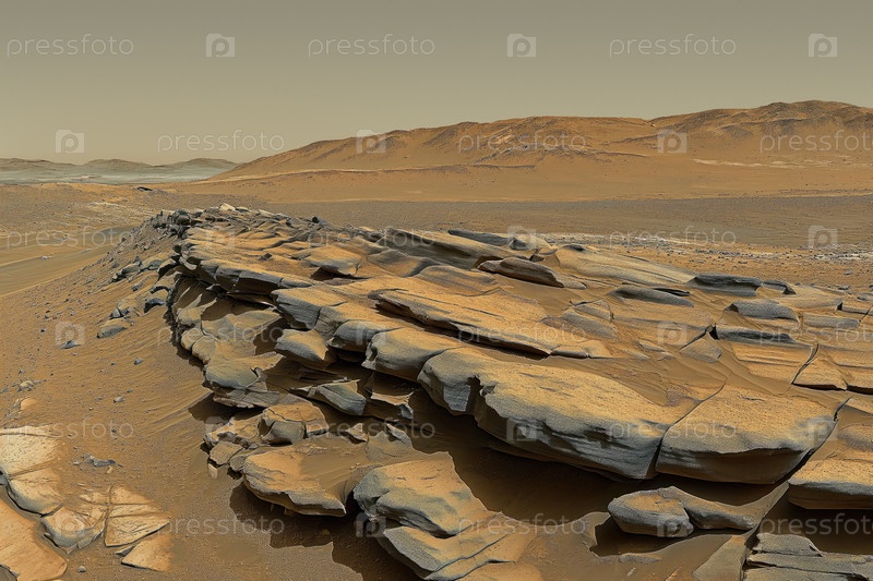 Подлинный марсианский пейзаж со слоистыми осадочными породами на переднем плане, которые могут быть признаками воды