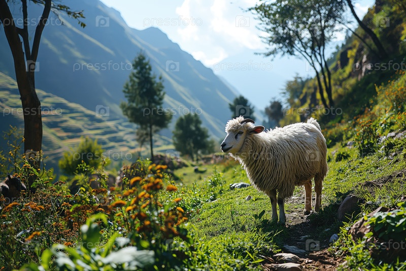 Домашние овцы в естественном ландшафте горной долины
