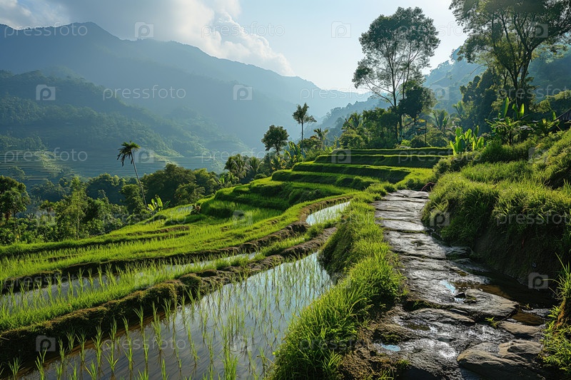 Зеленая тропическая долина с террасным земледелием