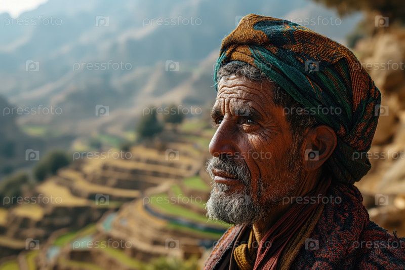 Арабский сельский мужчина в национальной одежде на фоне долины с сельскохозяйственными террасами