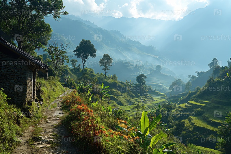 Красивая туманная долина с террасными полями
