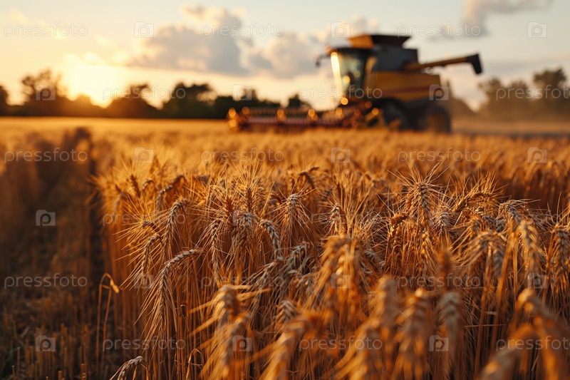 Колосья на поле и комбайн на заднем плане