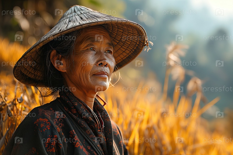 Азиатская сельская женщина в народной одежде на фоне размытого поля
