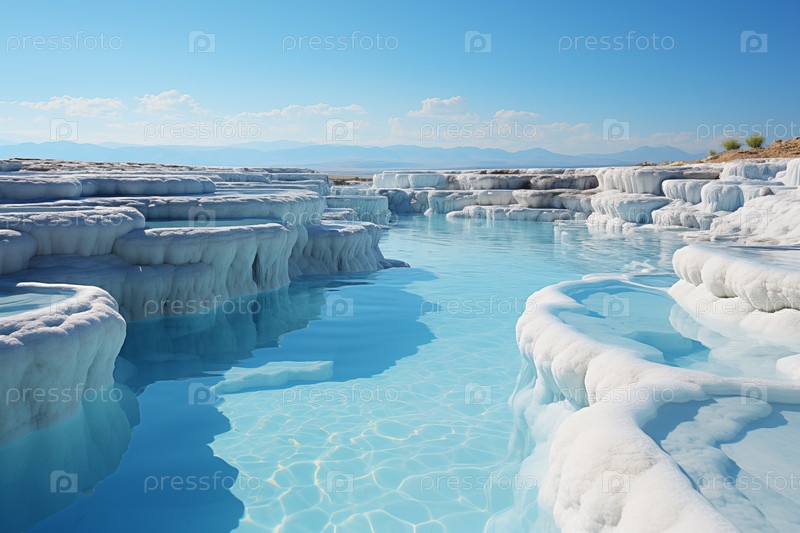 Ландшафт с травертиновыми бассейнами и террасами с голубой водой