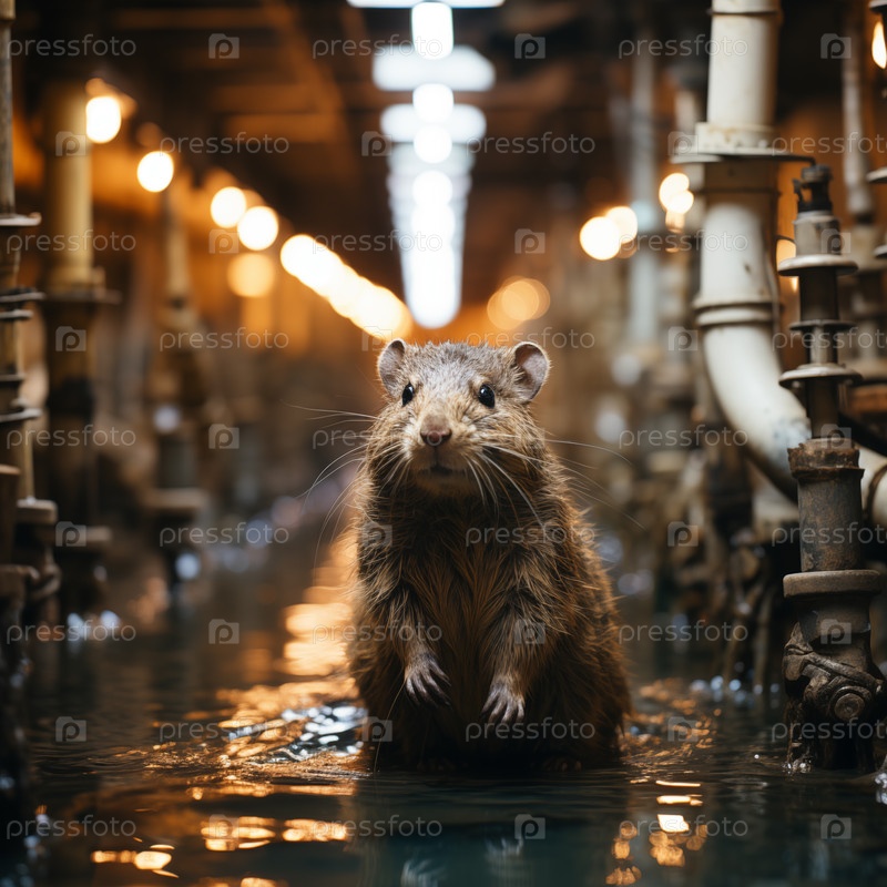 Мокрая коричневая крыса среди трубопроводов в затопленном подвале