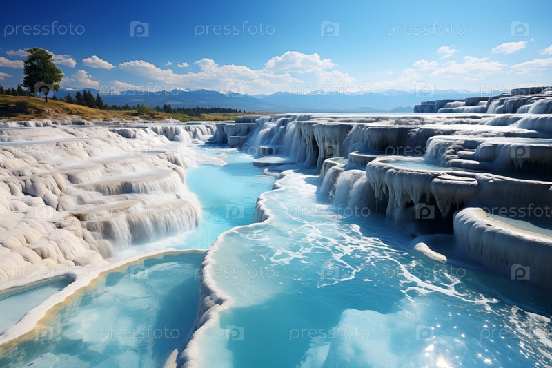 Ландшафт с травертиновыми бассейнами и террасами с голубой водой