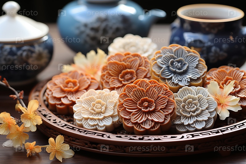 Традиционные китайские лунные пряники в виде цветов на подносе