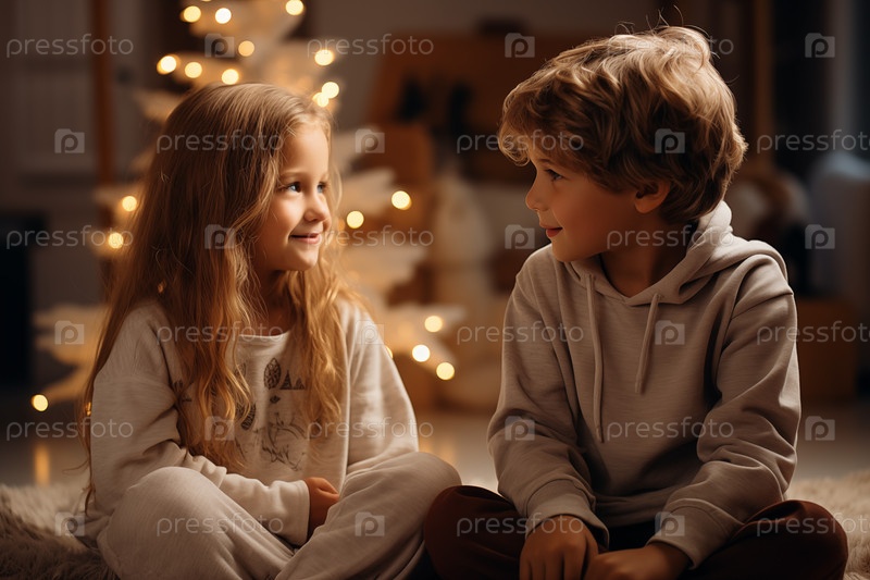 Маленький мальчик и девочка сидят на диване и общаются на праздничном рождественском фоне