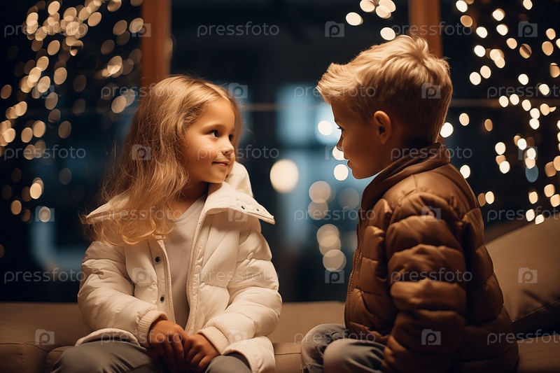 Маленький мальчик и девочка сидят на диване и общаются на праздничном новогоднем фоне