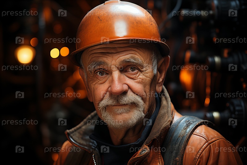 Портрет пожилого рабочего в каске на размытом промышленном фоне