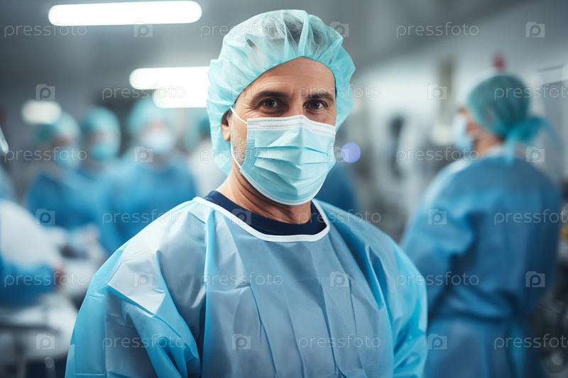 Портрет хирурга, стоящего в операционной с коллегами на заднем плане
