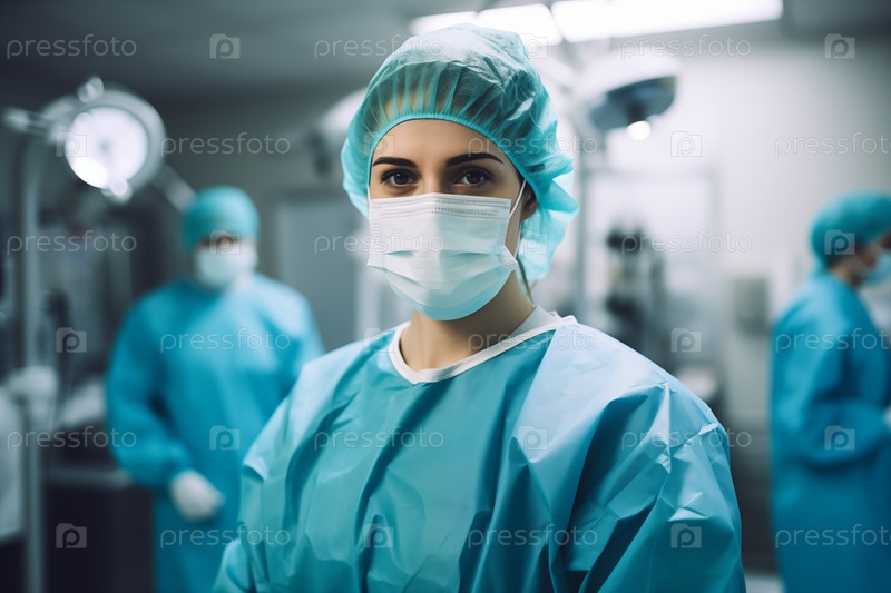Женщина-хирург в операционной. Группа хирургов в операционной с хирургическим оборудованием