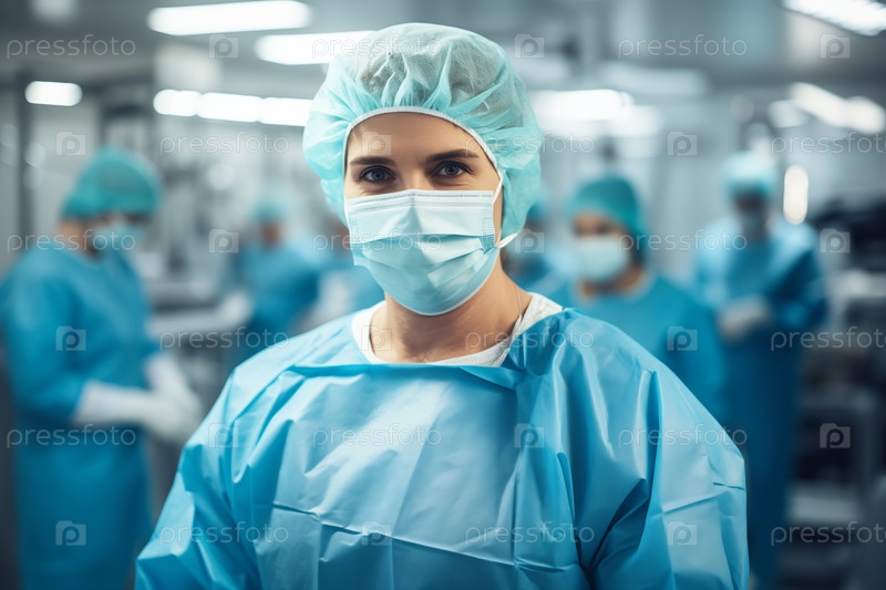 Врач в хирургическом костюме и маске на фоне операционной