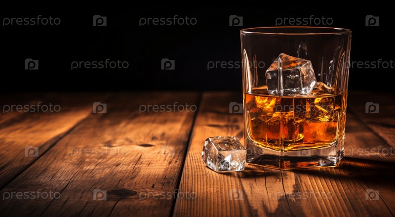 Стакан виски со льдом стоит на старом деревянном столе
