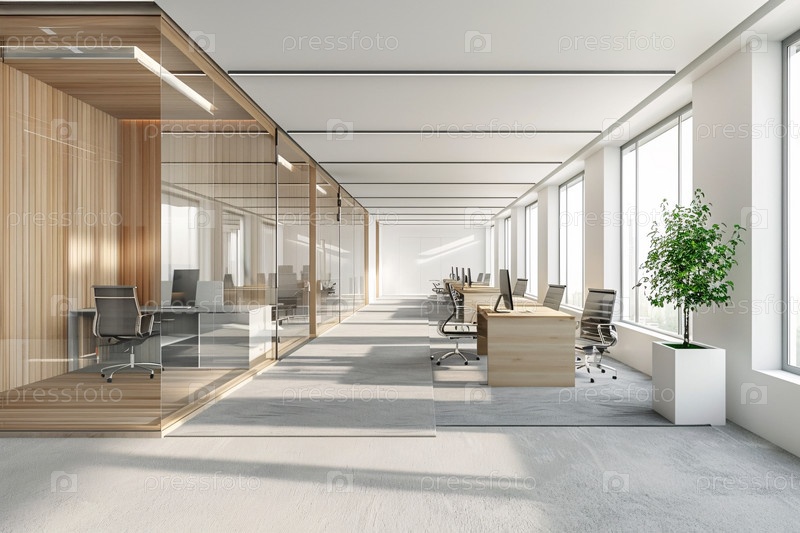 Современный офис открытой планировки со стеклянными стенами и естественным солнечным светом