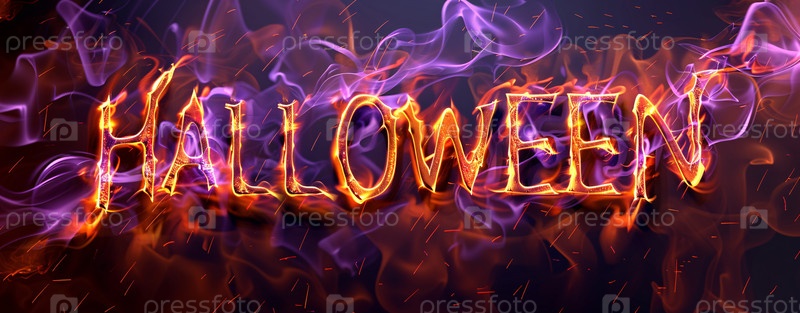 Огненный текст на Хэллоуин со светящимся пламенем и таинственным дымом