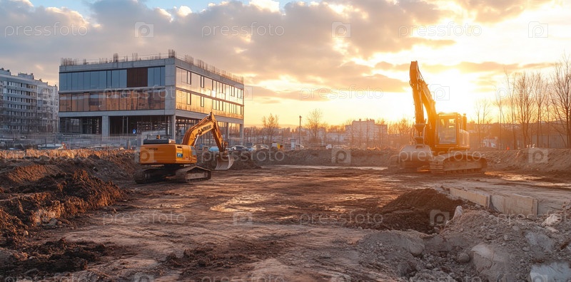 На строительной площадке кипит жизнь: краны и рабочие возводят новый небоскреб на фоне заката