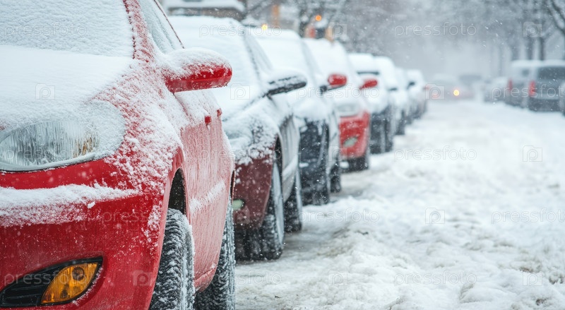 Снег покрывает живописный город, превращая улицы в зимнюю страну чудес, где машины и здания демонстрируют красоту этого времени года