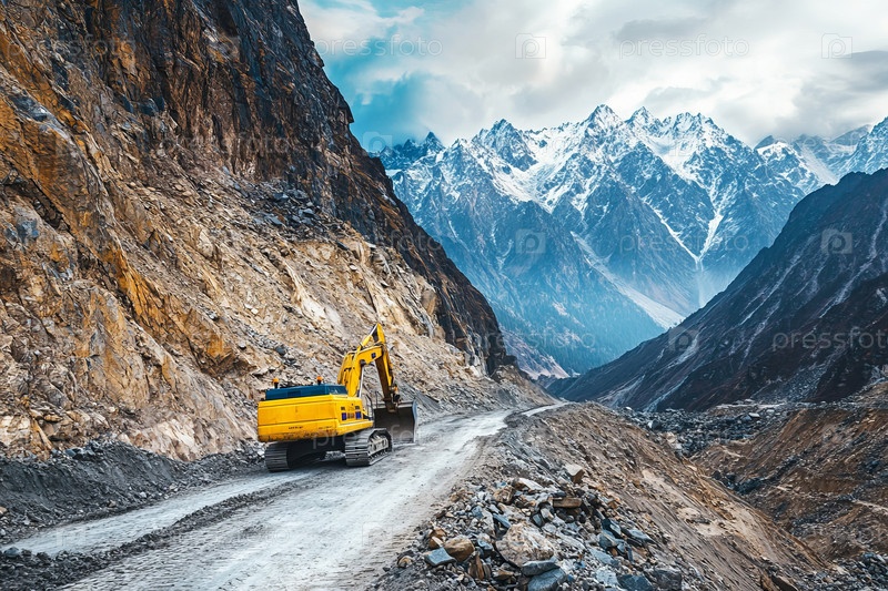 Экскаватор неустанно трудится в горной местности, прокладывая себе путь через каменистую местность под ясным голубым небом, демонстрируя сочетание человеческой инженерии и природной красоты
