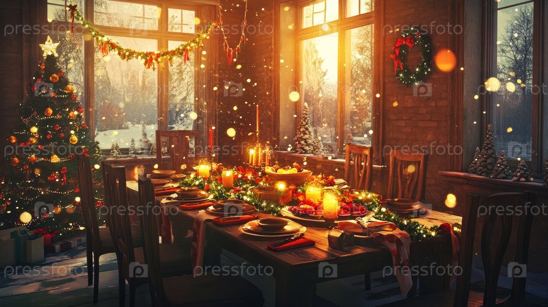Теплая, уютная сцена: семья наслаждается праздничным рождественским ужином в окружении мягкого света и украшений