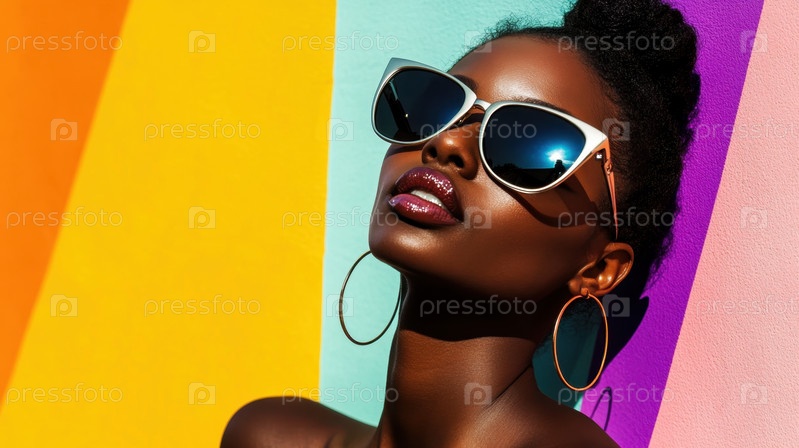Это яркое изображение демонстрирует потрясающий набор неоновых цветов, которые подчеркивают замысловатые локоны и шикарные модные аксессуары, создавая захватывающее визуальное заявление для любителей современного стиля.Сгенерированный нейросетью контент,