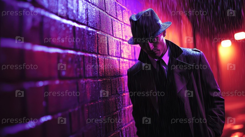 Таинственный человек в шляпе под неоновыми огнями ночью