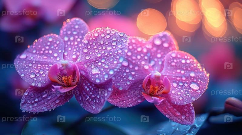 Крупный план розовых цветков орхидеи, покрытых каплями воды, освещенных мягким эффектом боке