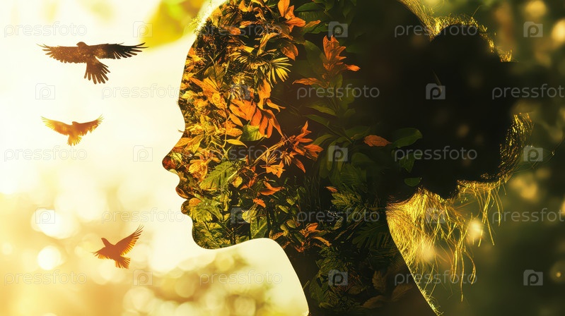 Силуэт женщины с природой, двойная экспозиция